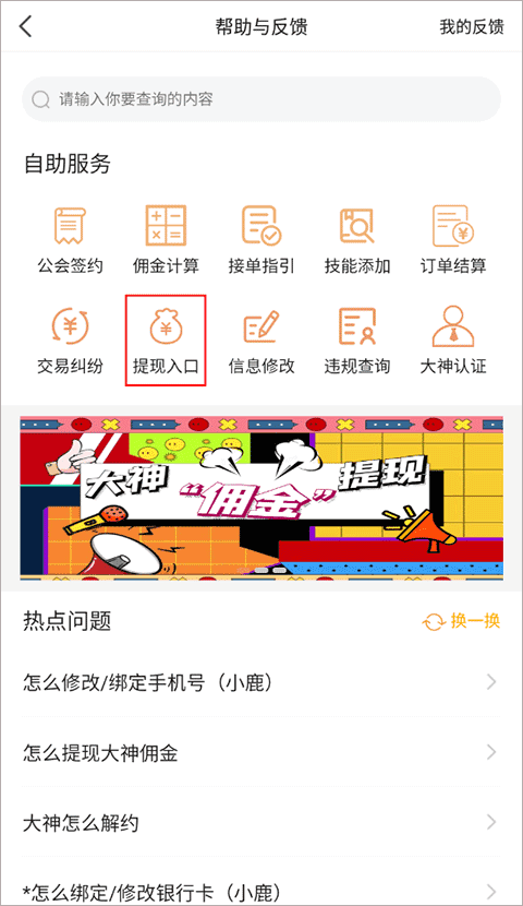 2、接着在自助服务版块中选择“提现入口”
