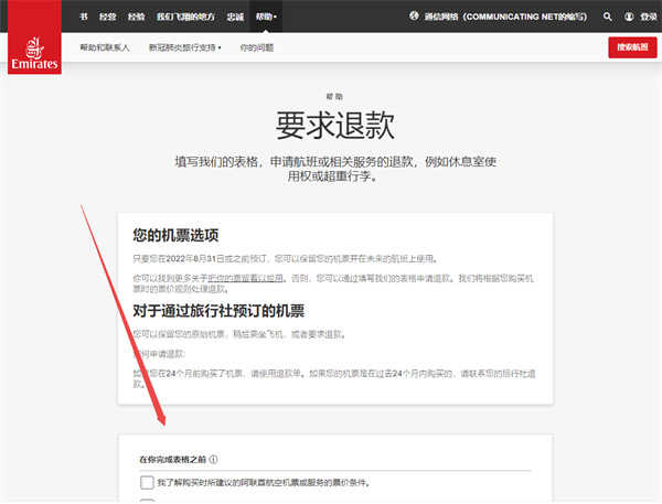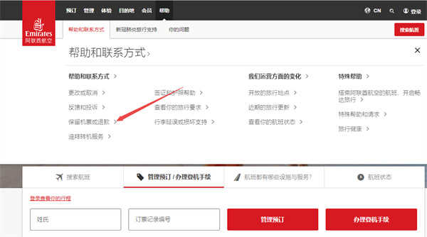 1、在浏览器上输入阿联酋航空官网(https://www.emirates.com/cn/chinese/),在官网首页点击帮助——联系我们;