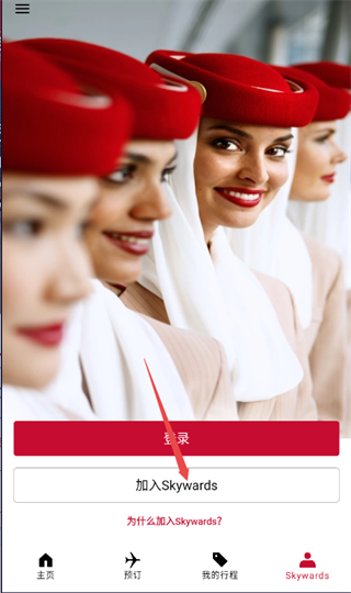 1、打开阿联酋航空app,在个人页面点击加入Skywards;