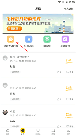 1、打开软件注册登录后,在“发现”界面点击“设置考试时间”;