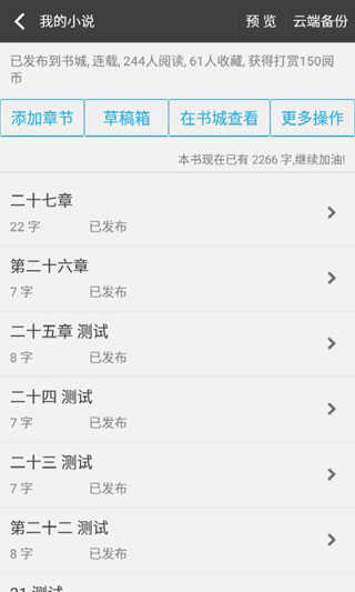 4、支持手机写小说功能、可随时随地创作小说、支持快捷标点、草稿箱、章节排序、首行缩进、小说预览、夜间模式、字体大小调节、导出TXT文件、支持云端备份和恢复、支持发布到书城、还可以得到读者的打赏。