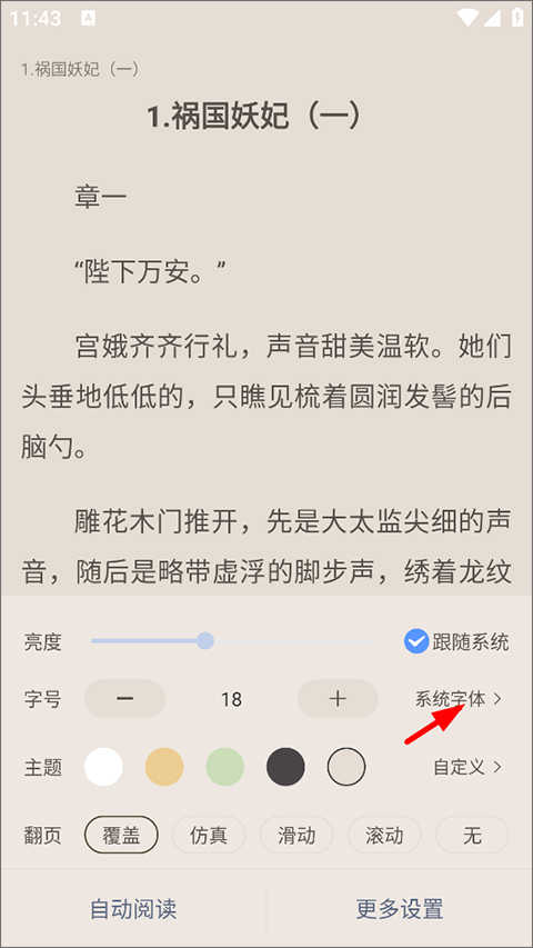 3、设置中打开阅读亮度、字号、主题以及翻页模式等,点击系统字体;