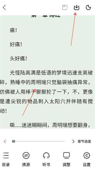 3、点击阅读页面中间位置,跳出设置,在右上角找到下载图标