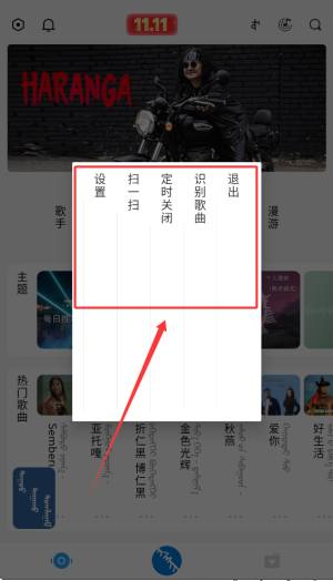 3、设置菜单包含账户退出、听歌识曲、定时停止及扫码登录等辅助工具。