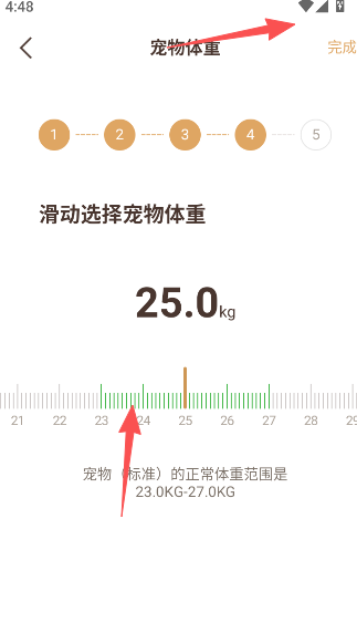 8、左右滑动设置宠物体重,点击完成保存即为添加成功。