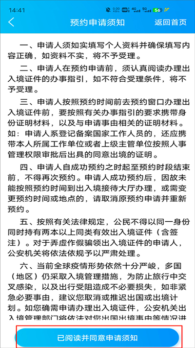 2、进入预约申请,查看相关信息,点击下方的已阅读并同意申请须知进入;