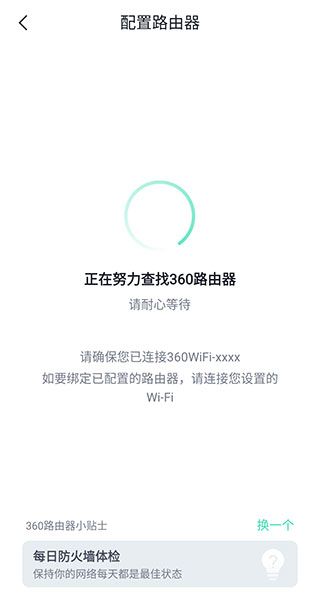 6、完成以上操作以后,软件会自动查找360路由器,请耐心等待。此过程中请确保您已连接360WiFi-xxxx,如要绑定已配置的路由器,请连接您设置的Wi-Fi。
