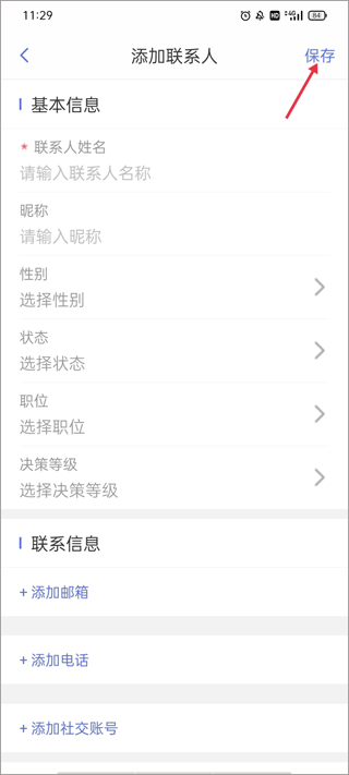 4、最后填写联系人的基本信息以及联系方式,最后点击保存,就添加好了。