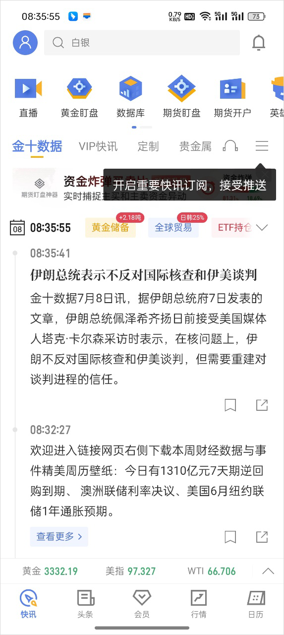 1、打开金十数据App后,下方导航栏会展示行情板块,如“外汇”“贵金属”“原油”等。