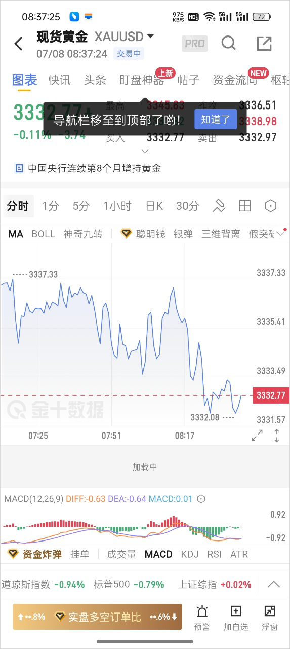 4、点击任意交易品种后,可查看分钟K线、日线等多周期图表,并支持技术指标选择,满足技术面分析需求。