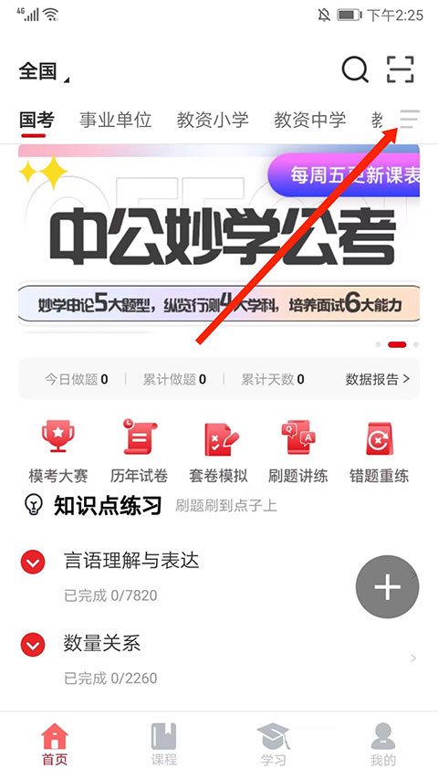 1、打开中公题库app,选择右上方“三条杠”图标,