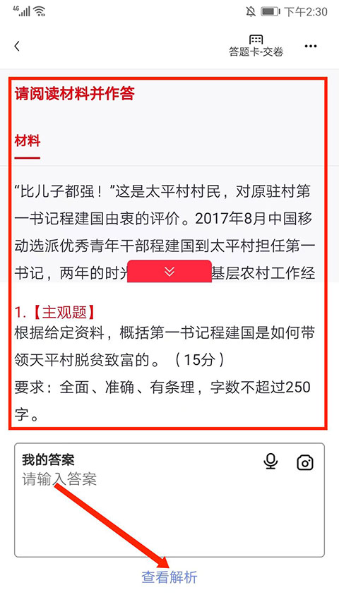3、进入申论题目界面,开始阅读申论材料并作答,选择下方“查看解析”可查看申论答案,