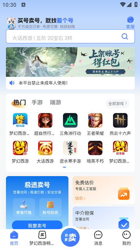 看个号app专注游戏账号买卖与装备交易,覆盖主流端游、手游及Steam平台,实名认证+多重风控体系,保障每一笔交易真实可靠、资金无忧,智能估价、一键上架、极速成交,让闲置账号秒变真金白银,支持《原神》《LOL》《CS2》《DNF》等500+热门游戏账号交易。