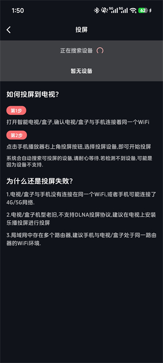 1、电视/盒子与手机没有连接在同一个WiFi,或者手机可能连接了4G/5G网络。
