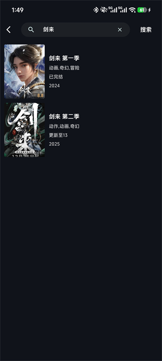点击顶部搜索框,输入作品名(如「剑来」),即可查看完整季数信息,还能通过热门搜索榜直接点选高人气作品。