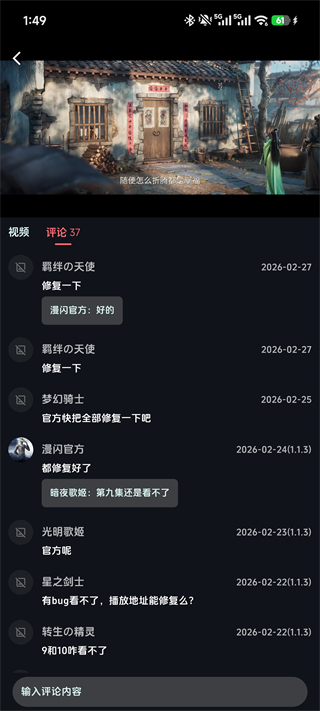 在播放页「评论」区查看用户反馈,也可留言反馈bug,官方会同步修复进度。