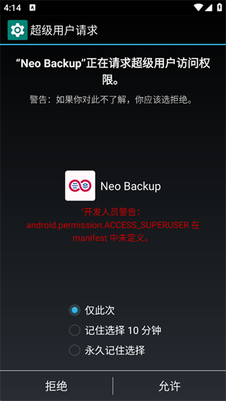 1、首次进入NeoBackup时会提示访问Root权限,如已Root的用户选择允许即可进入。