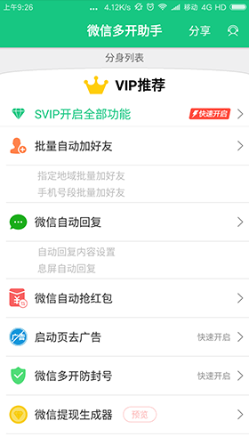 1.轻松免 费实现微信双开,微信多开,微信分身:告别多个微信账户来回切换的烦恼;一部手机,多个微信账号同时在线,放肆分享,放肆聊天。
