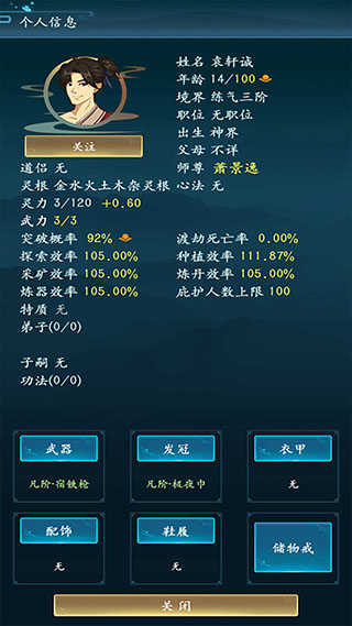 不做赘述,外门弟子推荐优先升级挖矿,其次采药,护山阵有资源就正常升级。重点說撰写功法,这个功法用处非常大。掌门和门内弟子每升- -个大段可以撰写功法,功法的作用是加成弟子的属性。举个例子,掌门人或某个弟子撰写了雷诀卷篇壹,该功法的效果是修炼率加成23%,要求必须有雷灵根必须是元婴,那么你门]内所有有雷灵根的弟子,当他修炼到元婴级别时,其修炼率就会有23%的加成。因此,一定要把所有的功法都写完,这样会大幅度提升你的修仙进程,甚至能让你三灵根的笨蛋弟子实现飞升。