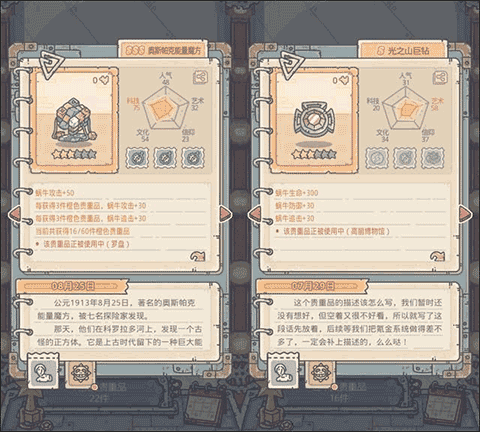 首先是蜗牛自己的战斗四围--生命、防御、攻击和追击,建议提升顺序是攻击>防御>追击>生命,此外还有主要由贵重品赋予的五围--人气、艺术、信仰、文化、科技。激活和改良贵重品都可以提高五围,但个人不太建议为了强堆五围去用炼金试剂改良暂时用不着的贵重品,毕竟作为一个月卡党我还是很缺炼金试剂的,当然土豪当我没说。