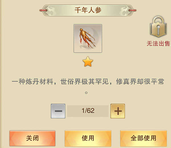 2、千年人参:炼丹材料,所有地图都出产,道童也给,刷图频繁炼丹不频繁的话会越来越多,但是有些丹药疯狂炼制的话人参会不够用,建议至少留六组以备不时之需。大量溢出可以换灵液。