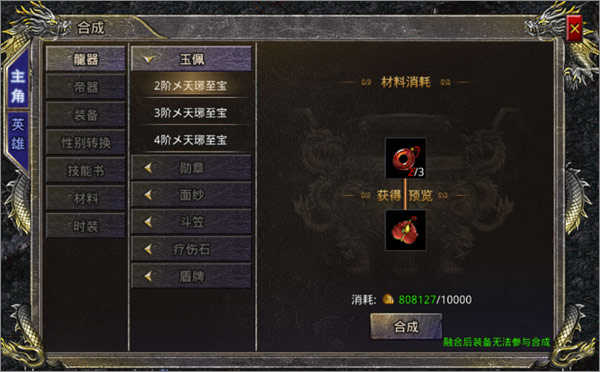 3、合成更高界别的玉佩面纱斗笠等装备类型