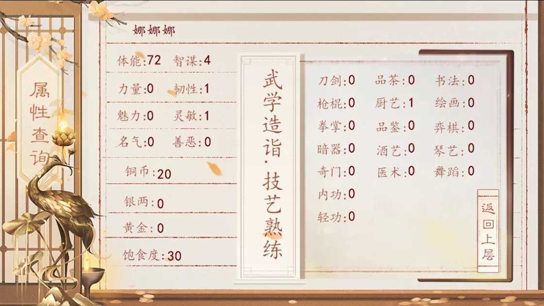 作者明言要做一个有取舍的作品,于是我研究完精评区后,也尽可能审慎的想要利用好每一个行动点,尽可能保持主线剧情的完整性。消极职业消极练武,一切以做人物鉴为主,各种大赛搁置,赚钱搞技能不管,在保证不饿死的前提下以剧情为优。而当我欢欢喜喜的走过春夏秋后,成功因为打不动小怪而差点被拦截在冬的大门口。虽然是剧情必胜的战斗,但是憋屈是实实在在的。深呼一口气告诉自己不在意,继续走剧情,最终因收集剧情过于沉迷武试表现过差光荣关了五日禁闭。