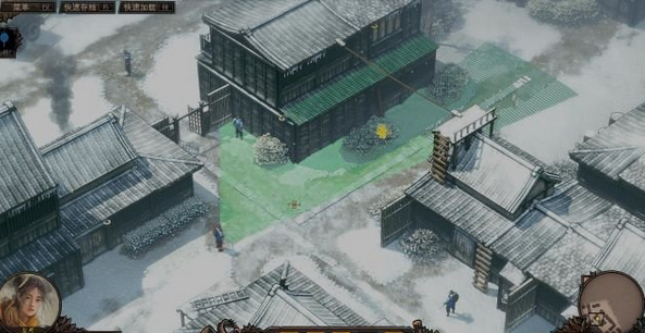 step5.从酒厂旁侧的门离开,接下来庭院门口有一名武士把守,让无垠从旁侧靠近与之单挑,然后马上藏身在街道左侧的草丛内。