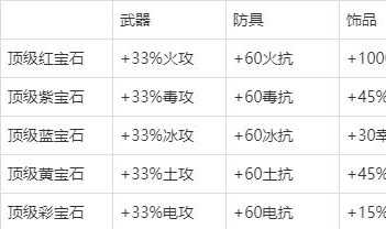 宝石分类:宝石分为红、紫、蓝、黄、彩五种,可以镶嵌到有孔的装备上,根据镶嵌目标装备的不同,会有不同的属性效果。比如红宝石,镶嵌到武器上增加火攻,镶嵌到防具上增加火抗,镶嵌到饰品上增加生命值。
