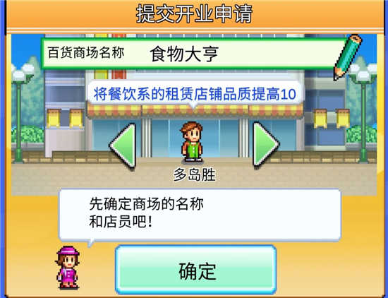 开头需要给自己店铺命名的时候,可以选一个系的店员,这个随意就可以了,后期肯定是什么店铺都有的,所以我就随便选了一个饮食系的员工(这个员工专长饮食系)。