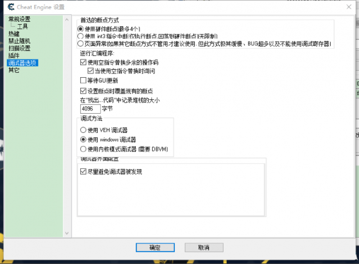 3、点击“编辑”菜单,选择“设置”——“调试器选项”,勾上“尽量避免调试器被发现”,点击确定。