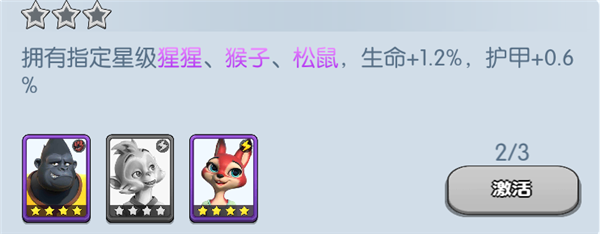 拥有指定星级猩猩、猴子、松鼠,生命+1.2%,护甲+0.6%