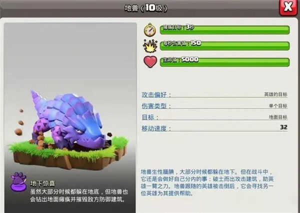 技能--躲在土里,钻出可瘫痪敌方防御建筑并攻击,且英雄死亡后可以跟其他英雄。