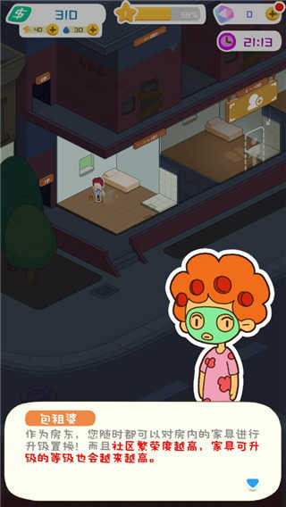 6、作为房东,您随时都可以对房内的家具进行升级置换,而且社区繁荣度越高,家具可升级的等级也会越来越高, 升级了家具,租客们会自觉提高租金的。没有人能从包租婆手下占到便宜,这里点击您想要进行操作的房间,就可以查看和升级家具,让我们看看101室都有些啥吧;