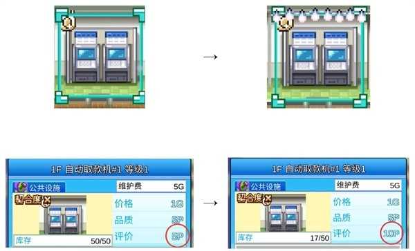 每一次升级店铺都可获得一定的点数选择提升店铺的品质和库存,个人建议除了少数几个后期有品质任务的建筑(如服务台,厕所)外全选择库存,特别是已经规划好的高收入店铺,避免出现“售罄”,因为“售罄”会直接停止当月的营业,如果不能保证自己的店铺够多,就选择多加库存而非品质