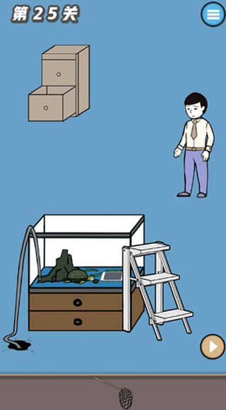 第25关:获得渔网,水管和梯子(旁边房间)后,先把水管插在地上的洞里,然后把梯子摆好,然后把渔网拖到手机的位置,即可过关。