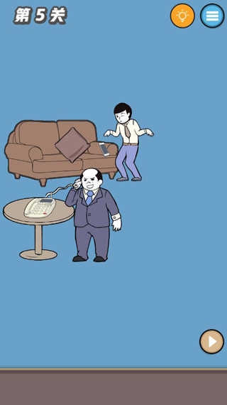 第17关:首先从抽屉里我们可以获得两个盒子,一个白的,一个红的,把红色的拿给老板,然后老板玩玩具的时候,点击沙发上的抱枕,后面就是你的手机啦。