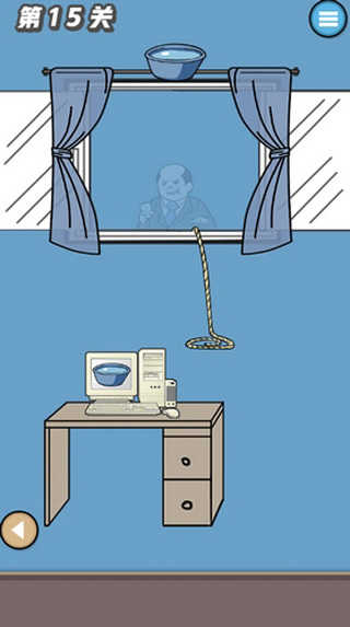 第15关:首先从书柜里获得绳子,然后电脑屏幕上获得一盆水,先把盆放到窗户上,然后在放绳子,然后你就等着老板乖乖把手机给你送上门吧。
