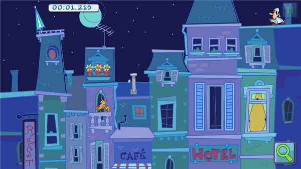 初进游戏,就感觉自己来到了一部深蓝色调的童话世界,寂静的夜晚注定不平凡,因为我们要帮助梦游的大使先生避开危险回到他的住处:卡通画面与吉米漫画极为相似,而儿童画手法所刻画的房屋也并不死板,相反,有些歪歪扭扭的线条显得充满童趣;再加上满天繁星璀璨和小狗汪汪叫等各种逗趣可爱让人身临其境的特色音效,整体给人的感觉无比舒适但又充满紧张感,像在体验一部动画电影一般。