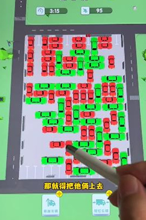 1、先把最下面能出去的粉色车和绿色车挪出去。