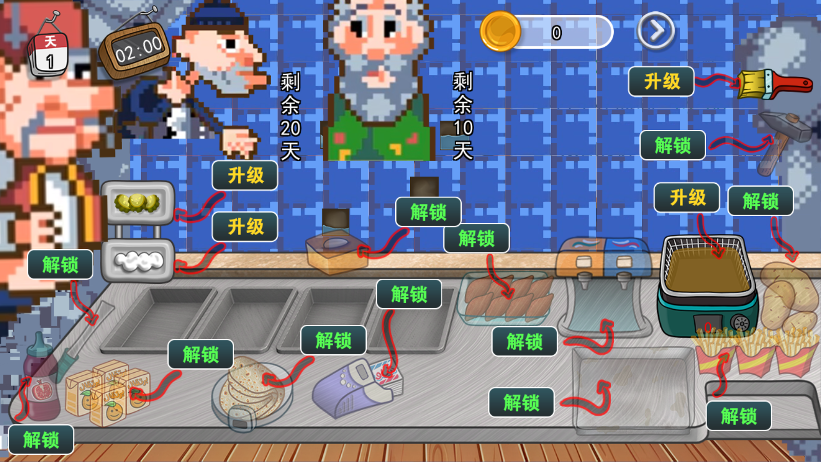 沙威玛像素小店最新版的玩法和原版一样十分简单容易上手,不过玩家也要分配好升级店铺的方向策略,优先提升增强烹饪效率的部分,这样才会拥有更好的游戏体验。