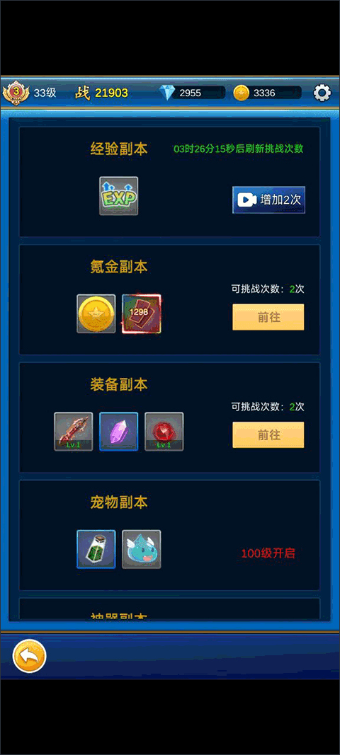2.资源分配优先级:中期资源向 “核心角色升星>装备强化>宠物培养” 倾斜。升星材料优先供给主输出角色,确保其能快速突破等级上限;装备选择 “攻击 + 暴击” 属性套装,强化时集中资源打造武器与头盔,提升输出效率;宠物系统解锁后先培养基础防御型宠物,降低副本损耗。