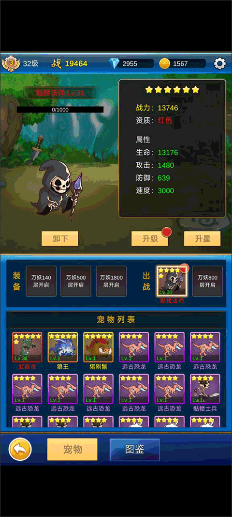 宠物目前来说机甲,犀牛,骷髅法师,武器灵(说白了就是最低ssr出身那几个)比较好。出战的选择攻击最高即可,血防仅对装备有用,目前反正是这样。(推荐出站武器灵,机甲,装备骷髅法师,符文犀牛等)有高星优先高星