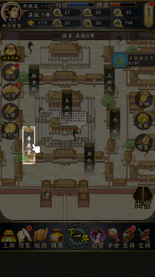2、首先是上朝,随机点击兵部、礼部等上书奏折,根据选择来获取/减少声望、政务。