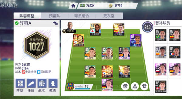 基于以上两点,前期的游戏节奏必然是以合卡为主,但合卡的随机性以及球员卡的快速变化,如果是用11人的纯血队套是很难上阵的,合出来的卡上不了阵就等于浪费战力,所以我这边给各位朋友一个前期百搭阵容,以8名90以下的球员卡+替补席凑出一个100化学的阵容,剩下三个主力位置可以上任意卡,来实现前期的战力最大化。