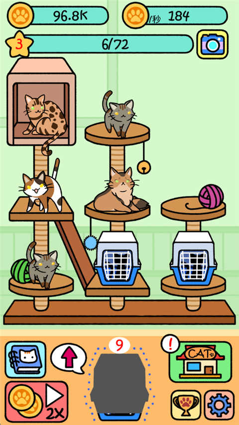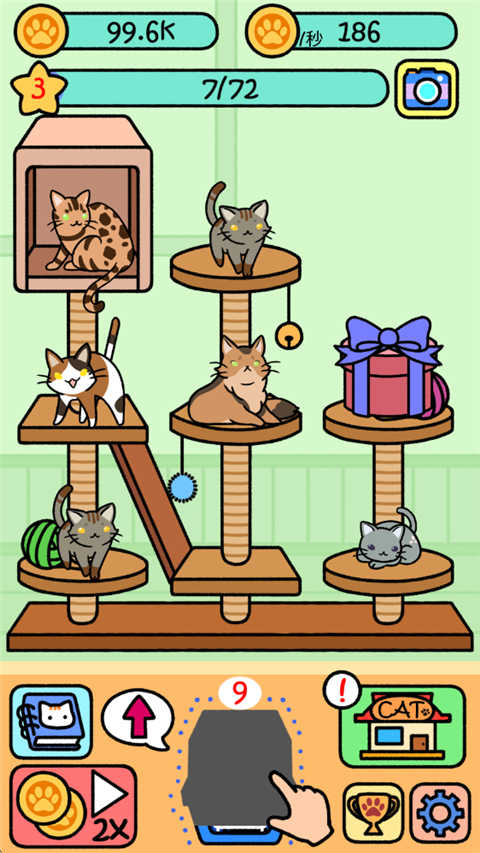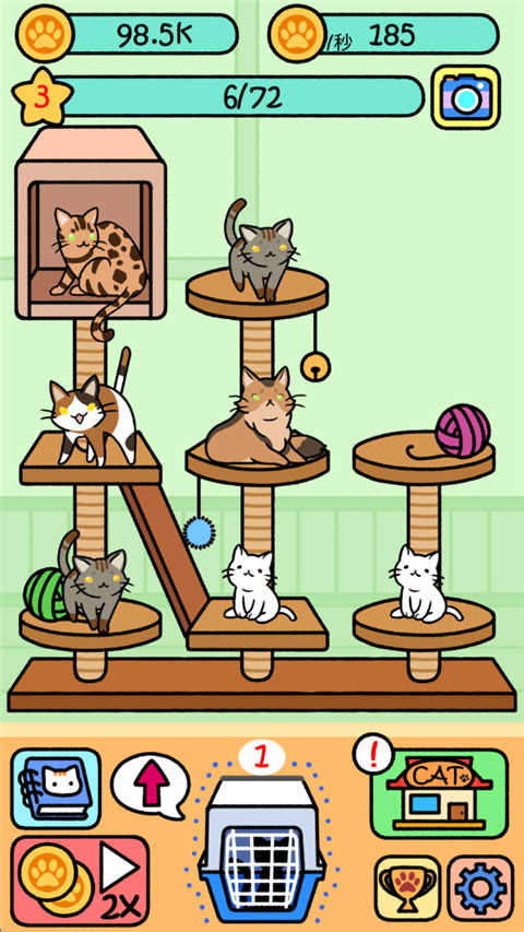 萌宠派对是一款休闲放置游戏。盲盒解锁各种稀有品种的猫咪,亲手培养自己的猫咪,轻轻松松的游戏,没有一点压力,不占用过多的时间。玩家只需要点击开启猫箱获得猫咪,通过相同的猫咪合成新的品种的猫咪,每一次解锁猫咪都会记录在你的相簿中,猫咪会自动生产金币,金币可以在商城中直接购买猫咪进行合成。玩家可以和萌宠们一起在游戏内进行探索冒险,完成游戏,获得奖励,这些奖励也可以帮助你获得更好的互动家具。
