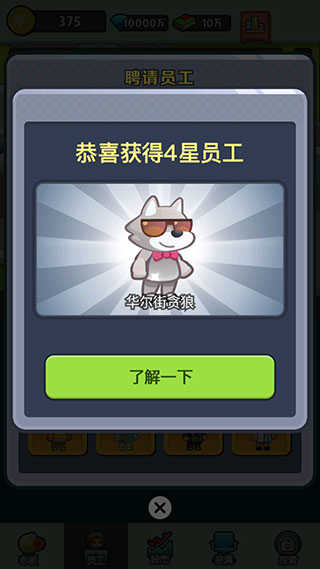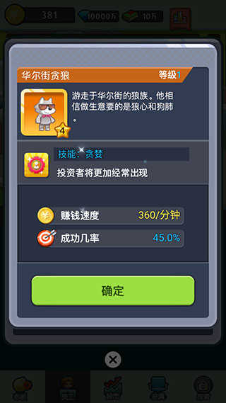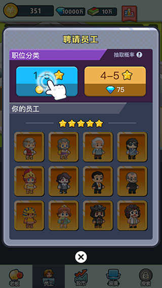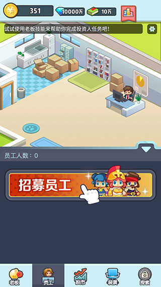 老板赚大钱作为一款放置类的模拟经营类手游,开局荣获天使投资的您将在这里开始自己的老板之路。游戏里玩家可以通过招募员工,扩大公司业务,不同员工的能力、技能各有所长,根据每位员工的能力分配到合适的岗位,能够最大化员工价值,同时也能加速公司的赚钱速度。无论是股市投资,还是方案实施,都是具有一定风险的,你有可能会因此获得一大笔财富,也有可能会白白损失一大笔资金,这都要取决于玩家的决断力和底下员工的实力了。