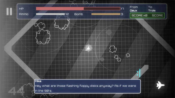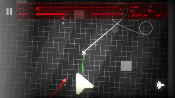 4、正式开始后点击左右屏幕可以控制飞行的方向,同时按住两边的屏幕可以发射子弹摧毁敌人和障碍物。屏幕上方的HP是血量,Ammo是弹药,Bomb是炸弹数量