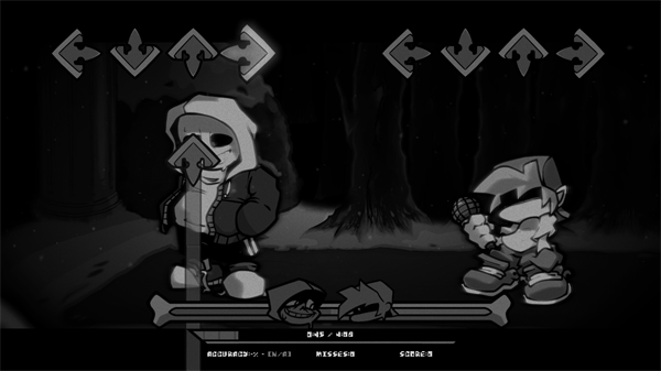 尽管Sans竭尽全力,他还是被击败了。他的血量在Boyfriend的连斩下逐渐减少。Sans精疲力竭,双眼紧闭,攻击也随之停止。他那熟悉的、死寂的故乡的旋律在他脑海中静静回荡,沉重的呼吸声仿佛又敲响了另一条时间线的丧钟。“Boyfriend”急切地挥舞着剑,但他再次闪避,沉重的身躯勉强躲过了另一次攻击。这时,“Boyfriend”突然出现在他身后,骷髅的眼睛睁得大大的,他的生命被迅速而无情地夺走了。