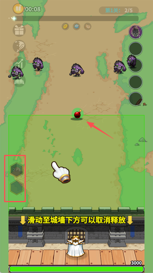 3、使用战斗道具时可通过滑动操作将其释放至城墙下方区域,合理把握释放时机,搭配场景中的增益道具,最大化战斗收益。